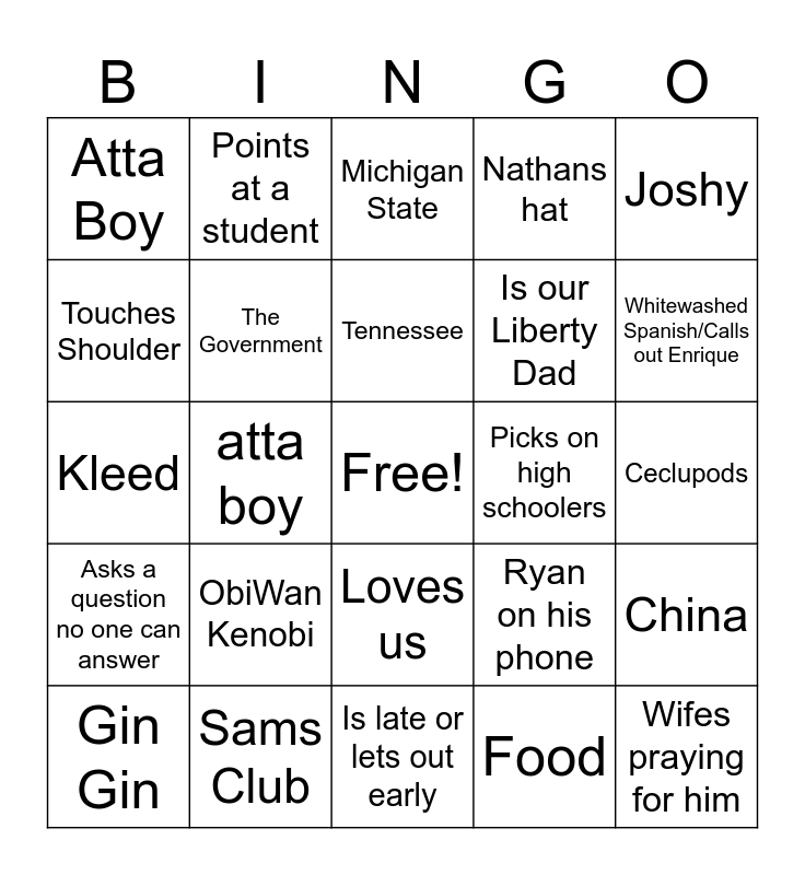 This bingo card has a free space and 24 words: ObiWan Kenobi, Sams Club, Tennessee, Gin Gin, Joshy, Atta Boy, Touches Shoulder, Points at a student, Picks on high schoolers, Loves us, Is our Liberty Dad, Kleed, Ryan on his phone, China, The Government, Food, Ceclupods, Michigan State, Whitewashed Spanish/Calls out Enrique, atta boy, Wifes praying for him, Asks a question no one can answer, Nathans hat and Is late or lets out early.