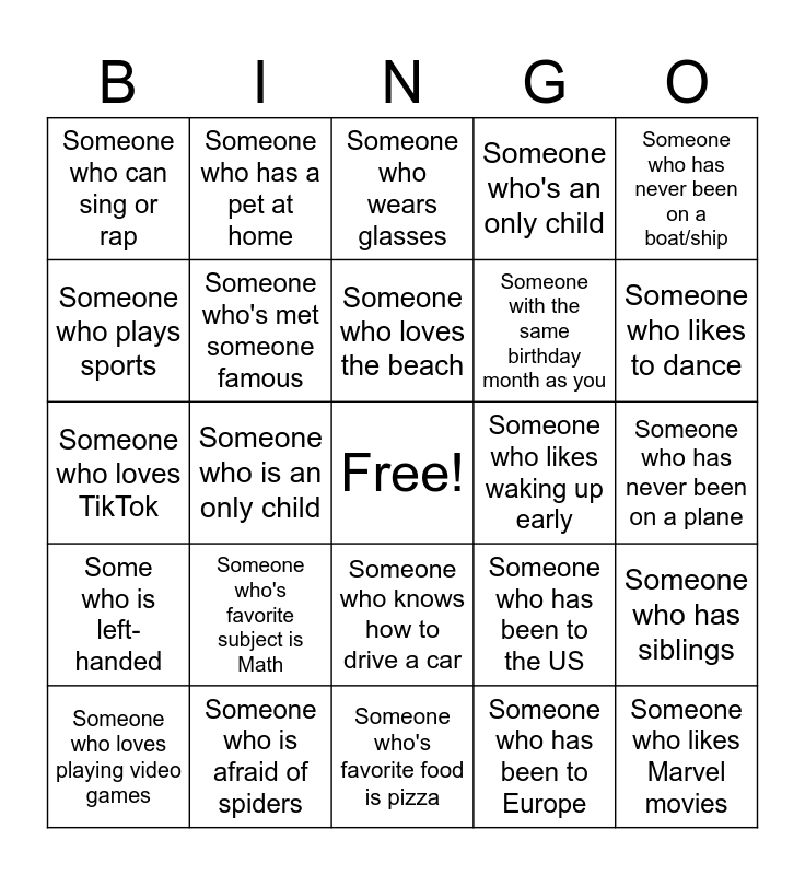 This bingo card has a free space and 28 words: Someone who has siblings, Someone who has been out of the country, Someone with the same birthday month as you, Someone who has been to Europe, Someone who plays sports, Someone who wears glasses, Someone who has a pet at home, Some who is left-handed, Someone who likes waking up early, Someone who loves playing video games, Someone who loves TikTok, Someone who's an only child, Someone who is afraid of spiders, Someone who's favorite food is pizza, Someone who likes to dance, Someone who is a K-pop fan, Someone who's favorite subject is Math, Someone who's met someone famous, Someone who loves the beach, Someone who knows how to drive a car, Someone who can sing or rap, Someone who has the same favorite color as you, Someone who likes Marvel movies, Someone who is an only child, Someone who has never been on a plane, Someone who has been to the US, Someone who has never been on a boat/ship and Someone who is afraid of heights.