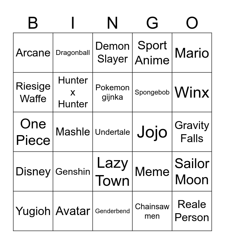 This bingo card has a free space and 24 words: Genshin, Avatar, Pokemon gijnka, Yugioh, Mario, Arcane, Riesige Waffe, Dragonball, Jojo, Lazy Town, Spongebob, One Piece, Meme, Sailor Moon, Hunter x Hunter, Chainsaw men, Gravity Falls, Demon Slayer, Winx, Mashle, Reale Person, Disney, Sport Anime and Genderbend.