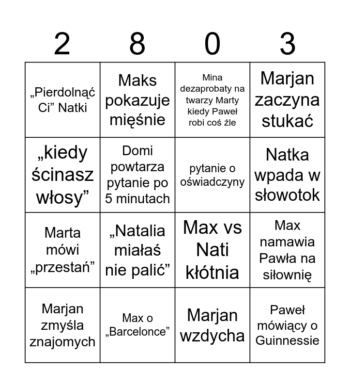 This bingo card has 19 words: Max vs Nati kłótnia, „debilu głupi” by Nati, Mina dezaprobaty na twarzy Marty kiedy Paweł robi coś źle, Paweł mówiący o Guinnessie, Max namawia Pawła na siłownię, „kiedy ścinasz włosy”, Marjan wzdycha, „Pierdolnąć Ci” Natki, Maks pokazuje mięśnie, Marta mówi „przestań”, „Natalia miałaś nie palić”, Domi powtarza pytanie po 5 minutach, pytanie o oświadczyny, Max o „Barcelonce”, Marjan zmyśla znajomych, Paweł o Wolfsburgu, Marjan zaczyna stukać, Natka wpada w słowotok and mecz na telefonie.