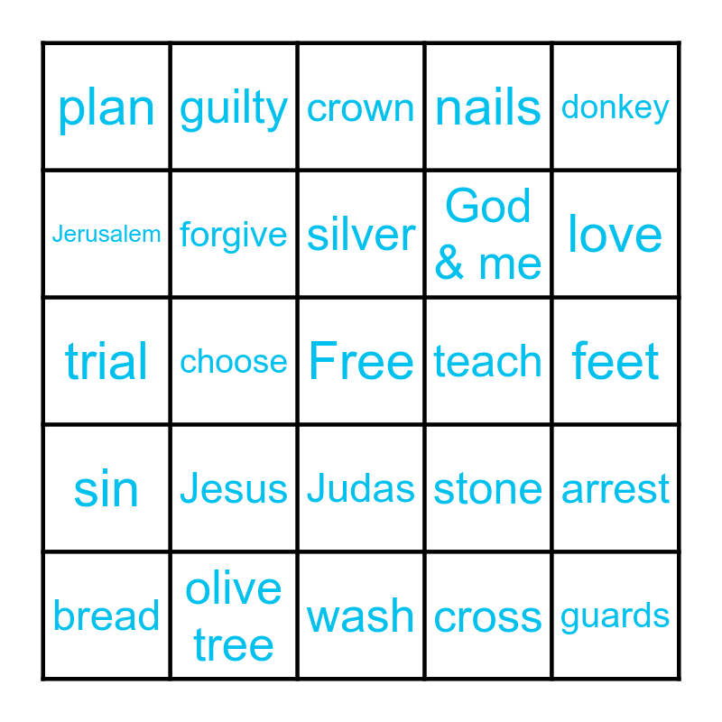 This bingo card has a free space and 34 words: palms, cross, dinner, prays, sin, forgive, donkey, bread, guilty, son of God, silver, crown, tomb, he lives!, teach, love, olive tree, trial, Jesus, stone, Judas, rescue, plan, feet, wash, guards, nails, soldier, God & me, Jerusalem, good right way, choose, arrest and darkness.