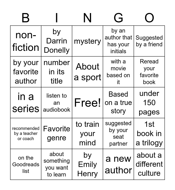 This bingo card has a free space and 24 words: Favorite genre, about something you want to learn, About a sport, on the Goodreads list, Suggested by a friend, non-fiction, by your favorite author, by Darrin Donelly, Based on a true story, to train your mind, with a movie based on it, in a series, suggested by your seat partner, 1st book in a trilogy, number in its title, a new author, under 150 pages, mystery, Reread your favorite book, listen to an audiobook, about a different culture, recommended by a teacher or coach, by an author that has your initials and by Emily Henry.