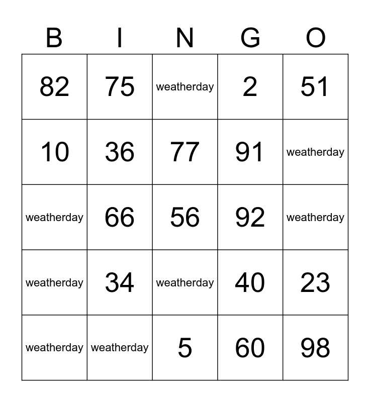 This bingo card has a free space and 48 words: 32, 98, 1, 5, 34, 59, 75, 99, 10, 3, 36, 2, 23, 40, 50, 49, 77, 92, 73, 51, 66, 60, 82, 91, weatherday, weatherday, weatherday, weatherday, weatherday, weatherday, weatherday, weatherday, weatherday, weatherday, weatherday, weatherday, weatherday, weatherday, weatherday, weatherday, weatherday, weatherday, weatherday, weatherday, weatherday, weatherday, weatherday and weatherday.