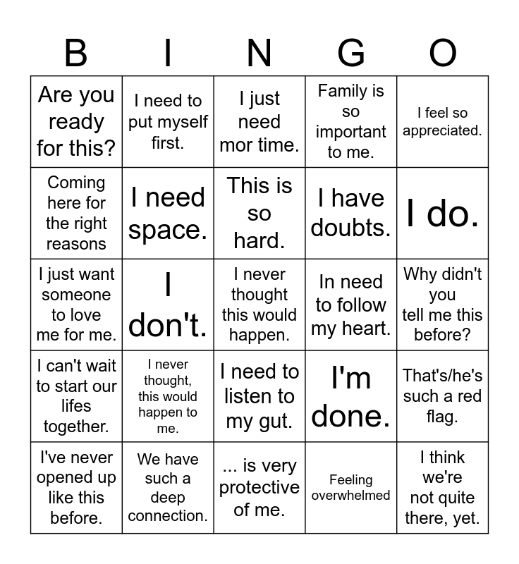 This bingo card has a free space and 24 words: I never thought, this would happen to me., We have such a deep connection., This is so hard., I've never opened up like this before., I feel so appreciated., Are you ready for this?, Coming here for the right reasons, I need to put myself first., In need to follow my heart., I need to listen to my gut., I have doubts., I just want someone to love me for me., I'm done., That's/he's such a red flag., I need space., Feeling overwhelmed, Why didn't you tell me this before?, I just need mor time., I do., I don't., I think we're not quite there, yet., I can't wait to start our lifes together., Family is so important to me. and ... is very protective of me..