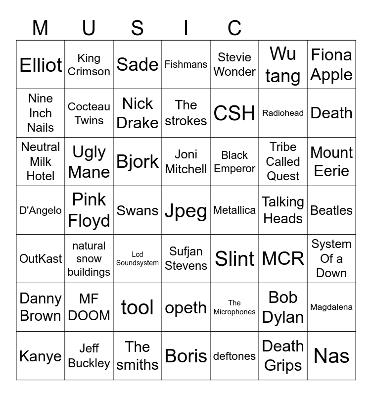 This bingo card has a free space and 48 words: The Microphones, Radiohead, Boris, Pink Floyd, Bjork, Beatles, King Crimson, Jeff Buckley, Wu tang, Sufjan Stevens, Fiona Apple, Fishmans, Tribe Called Quest, Black Emperor, Danny Brown, Talking Heads, Nine Inch Nails, Death, Bob Dylan, Stevie Wonder, CSH, Swans, Elliot, Cocteau Twins, Magdalena, Nick Drake, Mount Eerie, Kanye, Joni Mitchell, Ugly Mane, Death Grips, Metallica, System Of a Down, MF DOOM, D'Angelo, Slint, MCR, Neutral Milk Hotel, Lcd Soundsystem, tool, OutKast, Nas, Sade, The smiths, The strokes, opeth, natural snow buildings and deftones.
