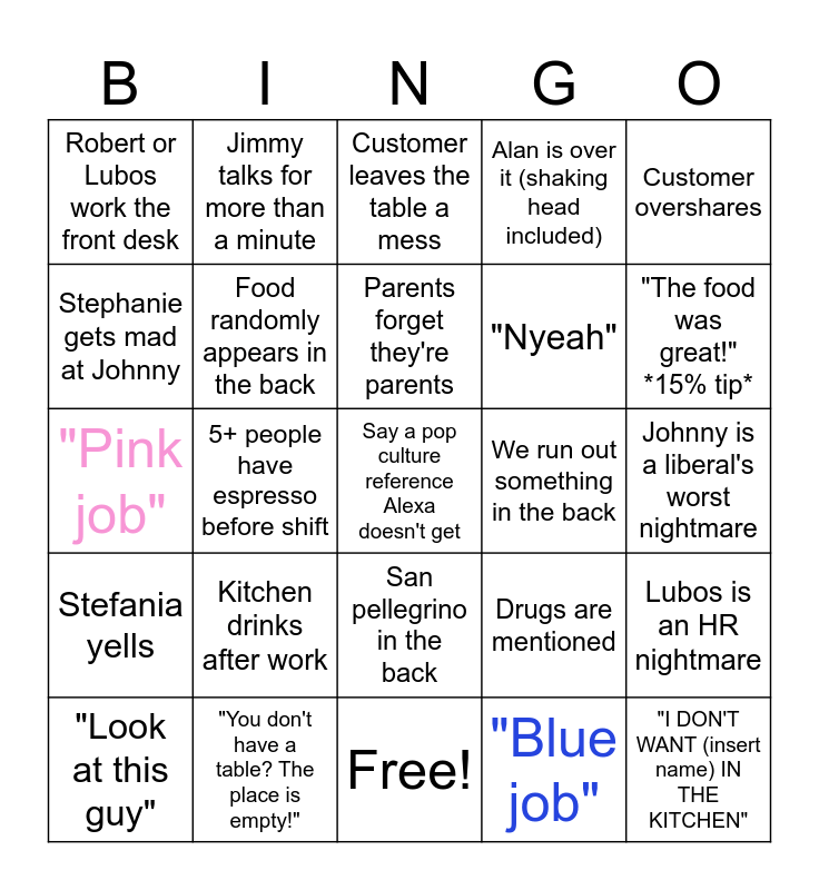 This bingo card has 25 words: Stefania yells, "You don't have a table? The place is empty!", Say a pop culture reference Alexa doesn't get, "Blue job", Customer overshares, Robert or Lubos work the front desk, Jimmy talks for more than a minute, Customer leaves the table a mess, We run out something in the back, Lubos is an HR nightmare, Stephanie gets mad at Johnny, Food randomly appears in the back, Free!, Drugs are mentioned, "The food was great!" *15% tip*, "Look at this guy", 5+ people have espresso before shift, Parents forget they're parents, "Nyeah", Johnny is a liberal's worst nightmare, "Pink job", Kitchen drinks after work, San pellegrino in the back, Alan is over it (shaking head included) and "I DON'T WANT (insert name) IN THE KITCHEN".