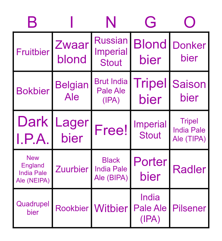 This bingo card has a free space and 35 words: Amber bier, American Pale Ale (APA), Barley Wine, Belgian Ale, Black India Pale Ale (BIPA), Blond bier, Bokbier, Bruin bier, Brut India Pale Ale (IPA), Champagnebier, Dark I.P.A., Donker bier, Double India Pale Ale (DIPA), Dubbel bier, Fruitbier, Imperial Stout, India Pale Ale (IPA), Lager bier, New England India Pale Ale (NEIPA), Pilsener, Porter bier, Quadrupel bier, Radler, Rookbier, Russian Imperial Stout, Saison bier, Session I.P.A., Stout bier, Tripel bier, Tripel India Pale Ale (TIPA), Weizenbier, Witbier, Zuurbier, Zwaar blond and Zwaar donker.