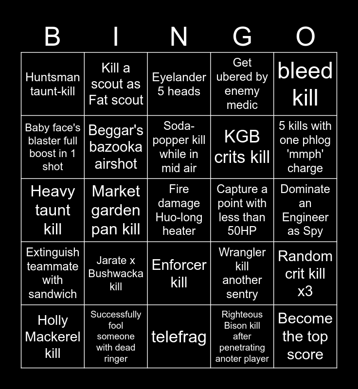 This bingo card has 55 words: All classes kill in 1 life, Holly Mackerel kill, Stun an ubered player, Huntsman taunt-kill, telefrag, Scullcutter random crit x2, Beggar's bazooka airshot, Back scatter spy kill, KGB crits kill, Machina double kill, Get ubered by enemy medic, Pompson medic kill, Frontier justice crits x10, Headshot airshot kill, Cow mangler sentry kill, Airblast kill, bleed kill, Market garden pan kill, Make someone rage-quit, Fire damage Huo-long heater, Capture a point with less than 50HP, Short Circuit kill, Wrangler kill another sentry, Eyelander 5 heads, Shield kill, Soda-popper kill while in mid air, Righteous Bison kill after penetrating anoter player, Volcano fragment + Flare gun crit, Dominate an Engineer as Spy, Random crit kill x3, Get full uber from ubersaw, Mantreads stomp kill, Wrench kill, Fan o'war Marked-for-death kill, Baby face's blaster full boost in 1 shot, Heavy taunt kill, Heal 5 players with Amputator, Extinguish teammate with sandwich, Become the top score, Revenge kill as sniper, Kill a scout as Fat scout, Dominate a player, 3 Bodyshot kills in one life, Kill someone with a reflected projectile, Jarate x Bushwacka kill, Successfully fool someone with dead ringer, Kill someone while standing on top of them, Destroy a building with red-tape recorder, Destroy a building with caber, 5 kills with one phlog 'mmph' charge, Blind sticky-bomb kill, Double donk kill, Buffalo Steak + Warrior's Spirit kill, Enforcer kill and Get a spycrab after backstab.