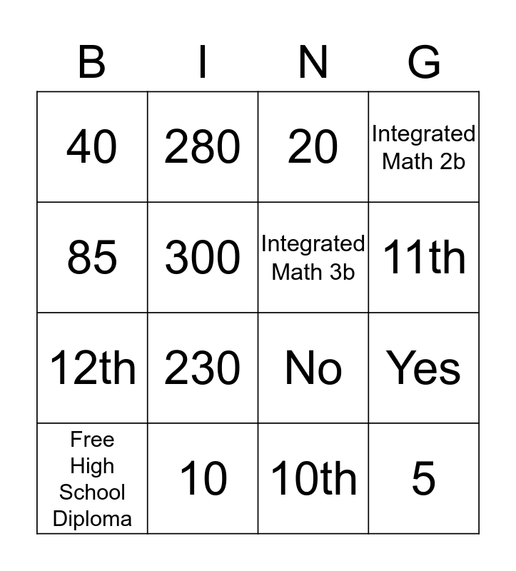 This bingo card has a free space and 15 words: Free High School Diploma, 5, 20, 40, 11th, 85, 230, 10th, 300, 12th, Yes, Integrated Math 2b, Integrated Math 3b, 280 and 10.