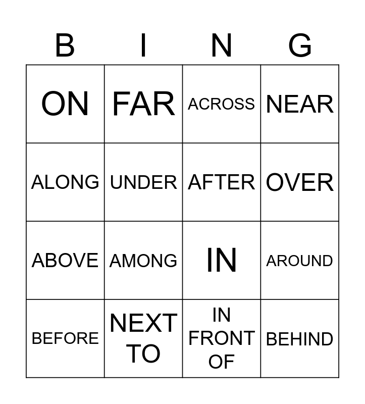 This bingo card has 18 words: AMONG, BEHIND, ACROSS, ON, IN, NEAR, BEFORE, FAR, OVER, ABOVE, IN FRONT OF, ALONG, AROUND, UNDER, AFTER, BETWEEN, NEXT TO and BELOW.