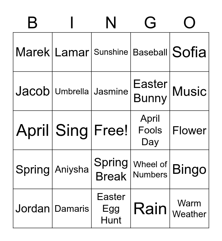 This bingo card has a free space and 24 words: Aniysha, Damaris, Jasmine, Jordan, Sofia, Marek, Jacob, Lamar, April Fools Day, Spring Break, Easter Bunny, April, Wheel of Numbers, Bingo, Umbrella, Rain, Flower, Sunshine, Music, Sing, Warm Weather, Spring, Baseball and Easter Egg Hunt.