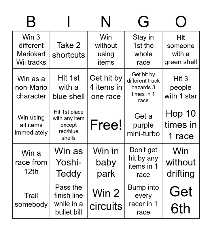 This bingo card has a free space and 24 words: Win as Yoshi-Teddy, Pass the finish line while in a bullet bill, Get hit by 4 items in one race, Trail somebody, Hit someone with a green shell, Win 3 different Mariokart Wii tracks, Win as a non-Mario character, Take 2 shortcuts, Get a purple mini-turbo, Win in baby park, Get hit by different track hazards 3 times in 1 race, Win using all items immediately, Don’t get hit by any items in 1 race, Win without drifting, Hit 1st with a blue shell, Bump into every racer in 1 race, Hop 10 times in 1 race, Win without using items, Hit 3 people with 1 star, Hit 1st place with any item except red/blue shells, Get 6th, Win a race from 12th, Stay in 1st the whole race and Win 2 circuits.