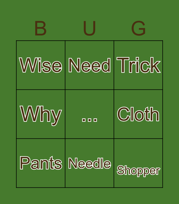 This bingo card has a free space and 12 words: Wider, Me, Shopper, Cloth, Need, Trick, Needle, Trees, Wise, Why, Pants and Mug.