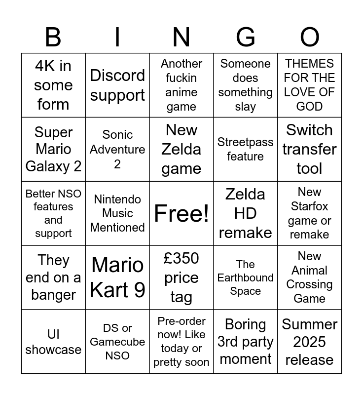 This bingo card has a free space and 24 words: Mario Kart 9, DS or Gamecube NSO, New Zelda game, UI showcase, THEMES FOR THE LOVE OF GOD, 4K in some form, Super Mario Galaxy 2, Discord support, Zelda HD remake, £350 price tag, Streetpass feature, Better NSO features and support, The Earthbound Space, New Animal Crossing Game, Sonic Adventure 2, Boring 3rd party moment, New Starfox game or remake, Another fuckin anime game, Switch transfer tool, Nintendo Music Mentioned, Summer 2025 release, They end on a banger, Someone does something slay and Pre-order now! Like today or pretty soon.