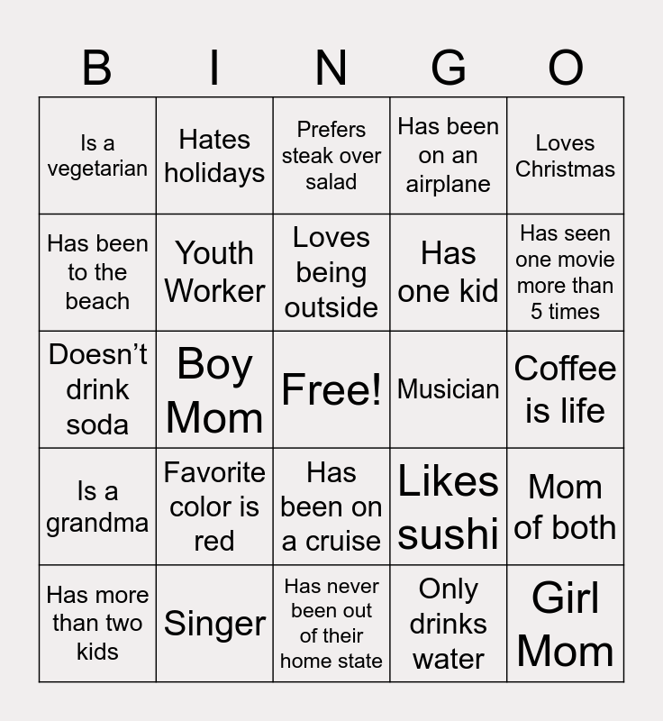 This bingo card has a free space and 24 words: Has more than two kids, Favorite color is red, Loves being outside, Only drinks water, Loves Christmas, Is a vegetarian, Hates holidays, Prefers steak over salad, Musician, Coffee is life, Doesn’t drink soda, Youth Worker, Likes sushi, Mom of both, Has been to the beach, Singer, Has never been out of their home state, Has been on an airplane, Has seen one movie more than 5 times, Is a grandma, Boy Mom, Has been on a cruise, Has one kid and Girl Mom.