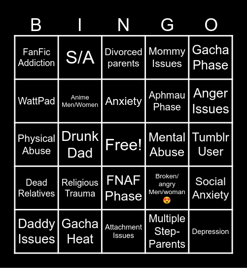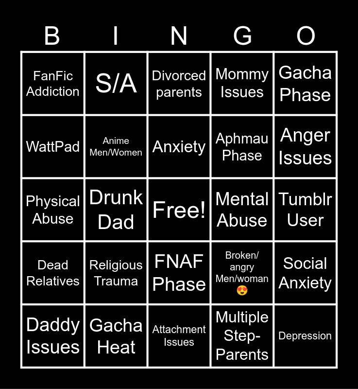 This bingo card has a free space and 24 words: Daddy Issues, Religious Trauma, Anxiety, Multiple Step-Parents, Gacha Phase, FanFic Addiction, S/A, Divorced parents, Mental Abuse, Tumblr User, Physical Abuse, Anime Men/Women, Broken/ angry Men/woman😍, Social Anxiety, WattPad, Gacha Heat, Attachment Issues, Mommy Issues, Anger Issues, Dead Relatives, Drunk Dad, FNAF Phase, Aphmau Phase and Depression.