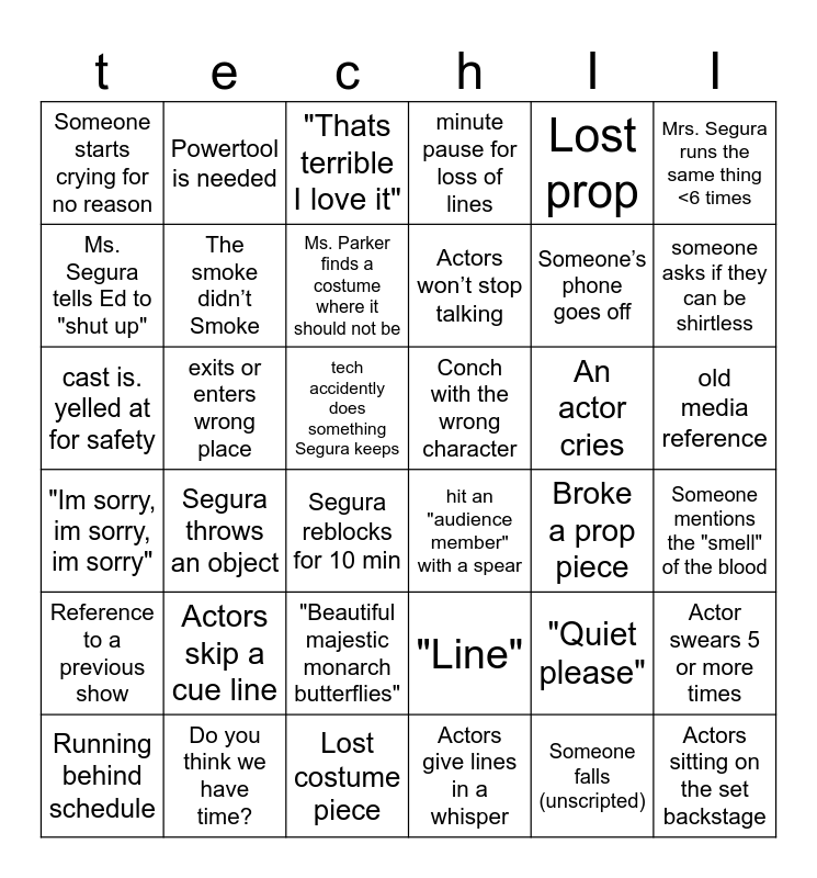 This bingo card has 42 words: Someone falls (unscripted), The smoke didn’t Smoke, Someone dropped something backstage, An actor cries, Someone mentions the "smell" of the blood, Segura throws an object, cast is. yelled at for safety, Mr B. drops keys, "Thats terrible I love it", old media reference, tech accidently does something Segura keeps, Actors won’t stop talking, someone asks if they can be shirtless, Lost prop, Do you think we have time?, "Im sorry, im sorry, im sorry", Actor swears 5 or more times, Someone’s phone goes off, Actors sitting on the set backstage, Powertool is needed, Mrs. Segura runs the same thing <6 times, "Beautiful majestic monarch butterflies", Reference to a previous show, Someone starts crying for no reason, Someone starts yelling for no reason, Running behind schedule, Ms. Parker finds a costume where it should not be, “HOLD!!!”, Actors skip a cue line, "Quiet please", Segura starts to snack nervously, Conch with the wrong character, Ms. Segura tells Ed to "shut up", Broke a prop piece, Lost costume piece, Segura reblocks for 10 min, hit an "audience member" with a spear, exits or enters wrong place, "Line", Actors give lines in a whisper, minute pause for loss of lines and Segura says "Get out of your head".
