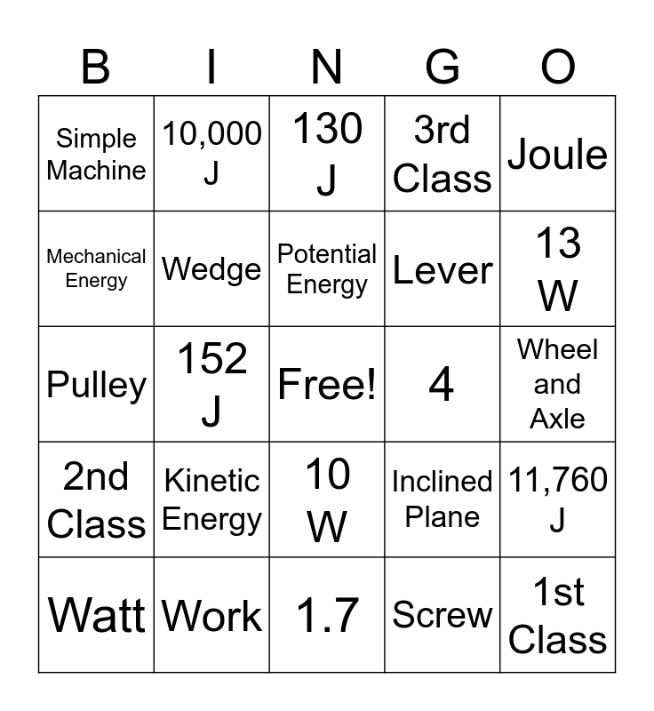 This bingo card has a free space and 24 words: Kinetic Energy, Work, Potential Energy, Watt, Joule, Simple Machine, Mechanical Energy, 10,000 J, 4, 10 W, Lever, Pulley, Inclined Plane, 11,760 J, Wedge, Screw, Wheel and Axle, 130 J, 13 W, 152 J, 1st Class, 2nd Class, 3rd Class and 1.7.