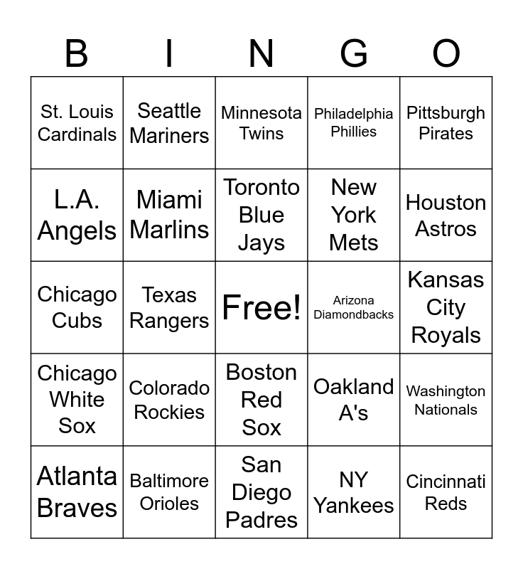 This bingo card has a free space and 26 words: Boston Red Sox, NY Yankees, Toronto Blue Jays, Baltimore Orioles, Pittsburgh Pirates, St. Louis Cardinals, L.A. Angels, Seattle Mariners, Kansas City Royals, Oakland A's, New York Mets, Chicago Cubs, Washington Nationals, Atlanta Braves, Texas Rangers, Milwaukee Brewers, Philadelphia Phillies, Chicago White Sox, Minnesota Twins, Cincinnati Reds, Houston Astros, San Diego Padres, Arizona Diamondbacks, Colorado Rockies, Miami Marlins and L.A. Dodgers.