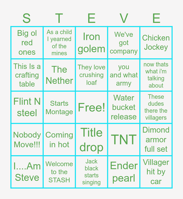 This bingo card has a free space and 24 words: I....Am Steve, Coming in hot, They love crushing loaf, Ender pearl, Chicken Jockey, Big ol red ones, As a child I yearned of the mines, Iron golem, Water bucket release, These dudes there the villagers, Flint N steel, The Nether, TNT, Dimond armor full set, This Is a crafting table, Welcome to the STASH, Jack black starts singing, We've got company, now thats what i'm talking about, Nobody Move!!!, Starts Montage, Title drop, you and what army and Villager hit by car.
