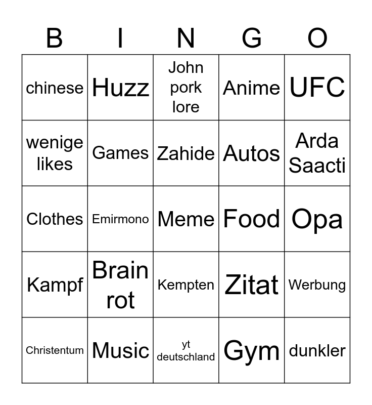 This bingo card has a free space and 24 words: Brain rot, Music, Zahide, Christentum, UFC, chinese, wenige likes, Huzz, Food, Kempten, Autos, Clothes, Zitat, Werbung, Games, Gym, Opa, John pork lore, Arda Saacti, Emirmono, dunkler, Kampf, Anime and yt deutschland.