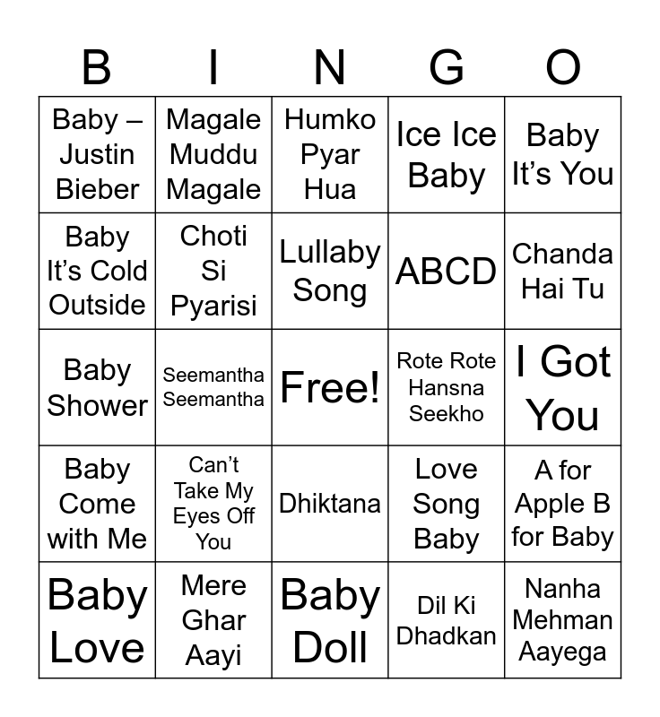 This bingo card has a free space and 40 words: Children’s Song, Baby Shower, Welcome Baby, Choti Si Pyarisi, Mere Ghar Aayi, Dhiktana, Lullaby Song, Pehli Nazar Mein, Baby It’s You, Baby Come with Me, Seemantha Seemantha, Ice Ice Baby, Nanha Mehman Aayega, I Got You, Rote Rote Hansna Seekho, Can’t Take My Eyes Off You, Rock a Bye Baby, Baby – Justin Bieber, Be My Baby, Humko Pyar Hua, A for Apple B for Baby, Dil Ki Dhadkan, ABCD, Baby It’s Cold Outside, Chaoro, Always Be My Baby, Hey Baby, Best Parts of Me, We’re Having A Baby, Meri Duniya Tu Hi Re, Papa Ki Pari, Baby Love, Baby Boy, Love Song Baby, Chanda Hai Tu, Baby Doll, Girls, My Girl, Magale Muddu Magale and Come on Over Baby.