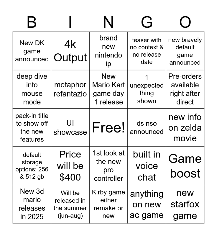 This bingo card has a free space and 24 words: Price will be $400, Will be released in the summer (jun-aug), New Mario Kart game day 1 release, New 3d mario releases in 2025, new bravely default game announced, New DK game announced, deep dive into mouse mode, 4k Output, ds nso announced, 1st look at the new pro controller, 1 unexpected thing shown, pack-in title to show off the new features, built in voice chat, Game boost, metaphor refantazio, anything on new ac game, new info on zelda movie, brand new nintendo ip, Pre-orders available right after direct, UI showcase, new starfox game, default storage options: 256 & 512 gb, teaser with no context & no release date and Kirby game either remake or new.