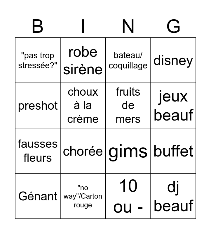 This bingo card has 16 words: "no way"/Carton rouge, buffet, bateau/ coquillage, "pas trop stressée?", fausses fleurs, robe sirène, gims, 10 ou -, preshot, choux à la crème, Génant, disney, chorée, jeux beauf, fruits de mers and dj beauf.