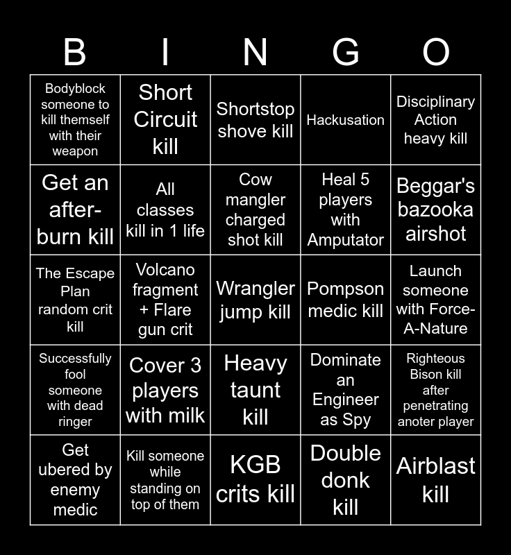 This bingo card has a free space and 79 words: Axtinguisher mini-crit kill, Get 4 kill with Air strike, Shortstop shove kill, Equalizer kill, B.A.S.E jumper stickies kill, Destroy a sentry with Rescue ranger, Gunslinger Crit kill, Eviction Notice kill, Tomislav stealth kill, Hot hand kill, Save a burning player with Crusader's Crossbow, Remove a sapper as pyro, Hackusation, Bodyblock someone to kill themself with their weapon, Fool someone using disguise and get a backstab, Get an after-burn kill, Reserve Shooter mini-crit kill, Cover 3 players with milk, Manmelter crit kill, Launch someone with Force-A-Nature, Sun-on-a-Stick crit kill, Disciplinary Action heavy kill, The Escape Plan random crit kill, Cow mangler charged shot kill, All classes kill in 1 life, Holly Mackerel kill, Stun an ubered player, Huntsman taunt-kill, telefrag, Scullcutter random crit x2, Beggar's bazooka airshot, Back scatter spy kill, KGB crits kill, Machina double kill, Get ubered by enemy medic, Pompson medic kill, Frontier justice crits x10, Headshot airshot kill, Cow mangler sentry kill, Airblast kill, bleed kill, Market garden pan kill, Make someone rage-quit, Fire damage Huo-long heater, Capture a point with less than 50HP, Short Circuit kill, Wrangler kill another sentry, Eyelander 5 heads, Shield kill, Soda-popper kill while in mid air, Righteous Bison kill after penetrating anoter player, Volcano fragment + Flare gun crit, Dominate an Engineer as Spy, Random crit kill x3, Get full uber from ubersaw, Mantreads stomp kill, Wrench kill, Fan o'war Marked-for-death kill, Baby face's blaster full boost in 1 shot, Heavy taunt kill, Heal 5 players with Amputator, Extinguish teammate with sandwich, Become the top score, Revenge kill as sniper, Kill a scout as Fat scout, Dominate a player, 3 Bodyshot kills in one life, Kill someone with a reflected projectile, Jarate x Bushwacka kill, Successfully fool someone with dead ringer, Kill someone while standing on top of them, Destroy a building with red-tape recorder, Destroy a building with caber, 5 kills with one phlog 'mmph' charge, Blind sticky-bomb kill, Double donk kill, Buffalo Steak + Warrior's Spirit kill, Enforcer kill and Get a spycrab after backstab.