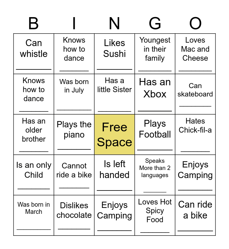 This bingo card has a free space and 32 words: Loves Hot Spicy Food _______, Is wearing jeans ________, Plays the piano _______, Has a Dog _______, Is an only Child _______, Was born in July _________, Loves Mac and Cheese ________, Enjoys Camping _______, Knows how to dance _______, Hates Pizza _______, Has a little Sister ________, Likes Sushi _______, Wrestles for school ________, Can whistle _______, Plays Football _______, Was NOT born in WA ________, Was born in March __________, Has an older brother _______, Is left handed _______, Cannot ride a bike _______, Speaks More than 2 languages _______, Plays soccer _______, Hates Chick-fil-a _______, Dislikes chocolate _______, Can ride a bike _______, Youngest in their family ________, Has an Xbox ______, Knows how to dance _______, Can whistle _______, Enjoys Camping _______, Has a nickname _______ and Can skateboard ________.