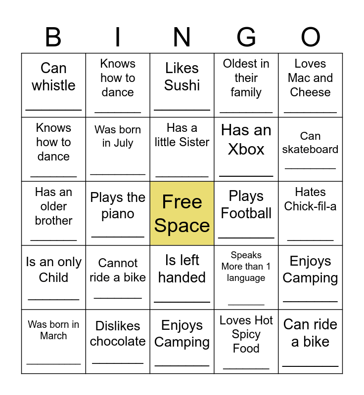 This bingo card has a free space and 32 words: Loves Hot Spicy Food _______, Is wearing jeans ________, Plays the piano _______, Has a Dog _______, Is an only Child _______, Was born in July _________, Loves Mac and Cheese ________, Enjoys Camping _______, Knows how to dance _______, Hates Pizza _______, Has a little Sister ________, Likes Sushi _______, Wrestles for school ________, Can whistle _______, Plays Football _______, Was NOT born in MD ________, Was born in March __________, Has an older brother _______, Is left handed _______, Cannot ride a bike _______, Speaks More than 1 language _______, Plays soccer _______, Hates Chick-fil-a _______, Dislikes chocolate _______, Can ride a bike _______, Oldest in their family ________, Has an Xbox ______, Knows how to dance _______, Can whistle _______, Enjoys Camping _______, Has a nickname _______ and Can skateboard ________.
