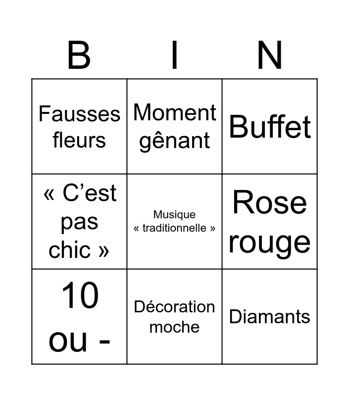 This bingo card has a free space and 8 words: Rose rouge, Buffet, Moment gênant, 10 ou -, Fausses fleurs, Diamants, « C’est pas chic » and Décoration moche.