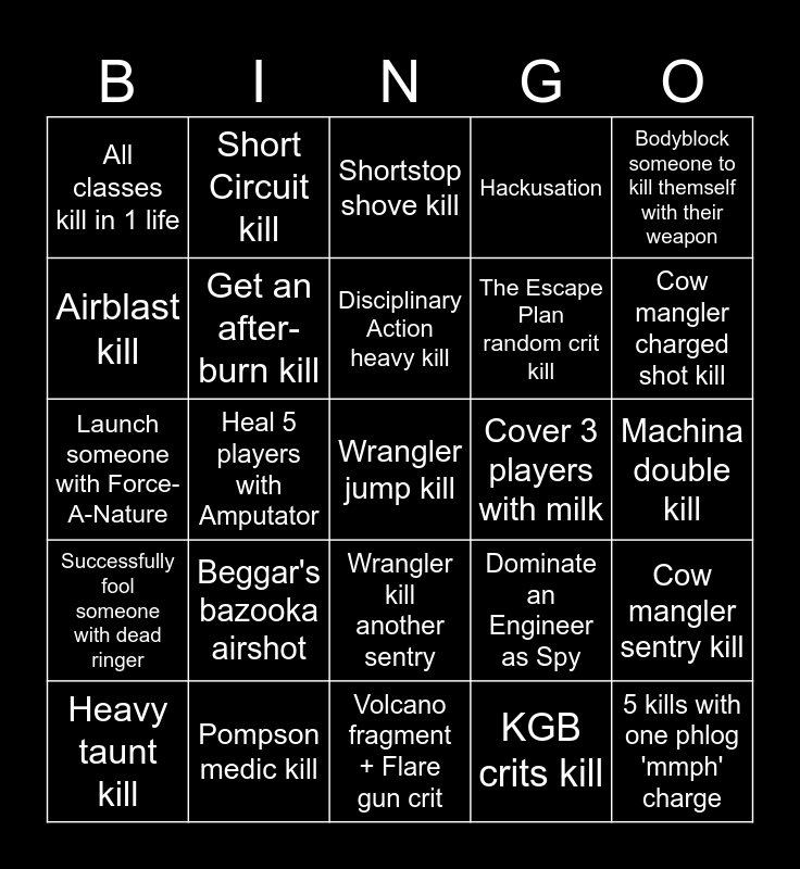 This bingo card has a free space and 79 words: Axtinguisher mini-crit kill, Get 4 kill with Air strike, Shortstop shove kill, Equalizer kill, B.A.S.E jumper stickies kill, Destroy a sentry with Rescue ranger, Gunslinger Crit kill, Eviction Notice kill, Tomislav stealth kill, Hot hand kill, Save a burning player with Crusader's Crossbow, Remove a sapper as pyro, Hackusation, Bodyblock someone to kill themself with their weapon, Fool someone using disguise and get a backstab, Get an after-burn kill, Reserve Shooter mini-crit kill, Cover 3 players with milk, Manmelter crit kill, Launch someone with Force-A-Nature, Sun-on-a-Stick crit kill, Disciplinary Action heavy kill, The Escape Plan random crit kill, Cow mangler charged shot kill, All classes kill in 1 life, Holly Mackerel kill, Stun an ubered player, Huntsman taunt-kill, telefrag, Scullcutter random crit x2, Beggar's bazooka airshot, Back scatter spy kill, KGB crits kill, Machina double kill, Get ubered by enemy medic, Pompson medic kill, Frontier justice crits x10, Headshot airshot kill, Cow mangler sentry kill, Airblast kill, bleed kill, Market garden pan kill, Make someone rage-quit, Fire damage Huo-long heater, Capture a point with less than 50HP, Short Circuit kill, Wrangler kill another sentry, Eyelander 5 heads, Shield kill, Soda-popper kill while in mid air, Righteous Bison kill after penetrating anoter player, Volcano fragment + Flare gun crit, Dominate an Engineer as Spy, Random crit kill x3, Get full uber from ubersaw, Mantreads stomp kill, Wrench kill, Fan o'war Marked-for-death kill, Baby face's blaster full boost in 1 shot, Heavy taunt kill, Heal 5 players with Amputator, Extinguish teammate with sandwich, Become the top score, Revenge kill as sniper, Kill a scout as Fat scout, Dominate a player, 3 Bodyshot kills in one life, Kill someone with a reflected projectile, Jarate x Bushwacka kill, Successfully fool someone with dead ringer, Kill someone while standing on top of them, Destroy a building with red-tape recorder, Destroy a building with caber, 5 kills with one phlog 'mmph' charge, Blind sticky-bomb kill, Double donk kill, Buffalo Steak + Warrior's Spirit kill, Enforcer kill and Get a spycrab after backstab.