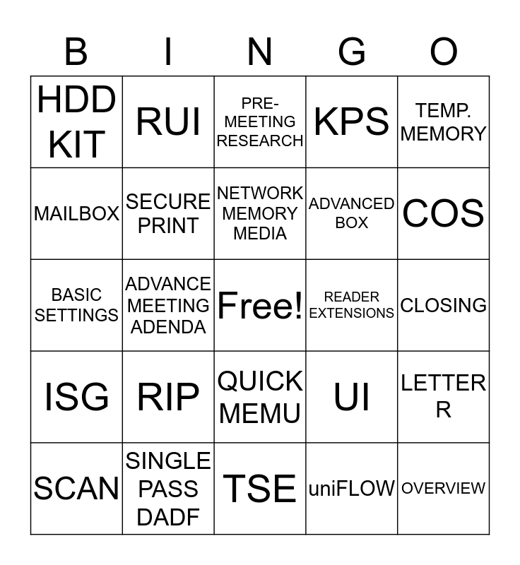 This bingo card has a free space and 24 words: RIP, SINGLE PASS DADF, NETWORK MEMORY MEDIA, SCAN, TEMP. MEMORY, HDD KIT, MAILBOX, RUI, READER EXTENSIONS, QUICK MEMU, ADVANCED BOX, BASIC SETTINGS, UI, LETTER R, SECURE PRINT, uniFLOW, CLOSING, PRE- MEETING RESEARCH, COS, ADVANCE MEETING ADENDA, OVERVIEW, ISG, KPS and TSE.