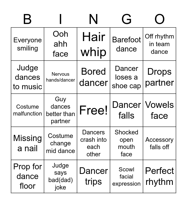 This bingo card has a free space and 26 words: Dancers crash into each other, Scowl facial expression, Bored dancer, Judge says bad(dad) joke, Off rhythm in team dance, Everyone smiling, Judge dances to music, Ooh ahh face, Vowels face, Shocked open mouth face, Dancer loses a shoe cap, Costume malfunction, Accessory falls off, Prop for dance floor, Guy dances better than partner, Dancer counting mid dance, Barefoot dance, Missing a nail, Hair whip, Perfect rhythm, Drops partner, Dancer trips, Dancer falls, Costume change mid dance, Nervous hands/dancer and Crowd interacts.