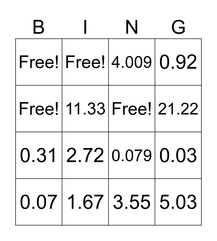 This bingo card has 16 words: 1.67, 0.03, 4.009, Free!, 0.31, Free!, 0.079, 3.55, Free!, 11.33, 0.07, 0.92, 2.72, 21.22, Free! and 5.03.