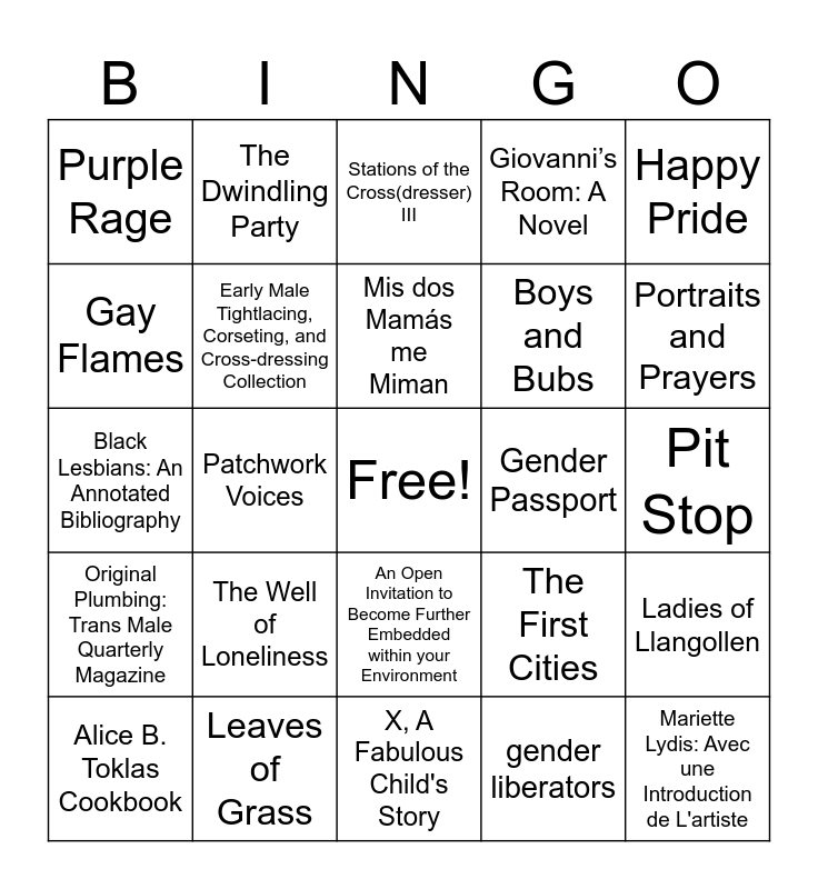 This bingo card has a free space and 24 words: The Well of Loneliness, Leaves of Grass, Mis dos Mamás me Miman, Alice B. Toklas Cookbook, Happy Pride, Purple Rage, Gay Flames, The Dwindling Party, Gender Passport, An Open Invitation to Become Further Embedded within your Environment, Boys and Bubs, Black Lesbians: An Annotated Bibliography, The First Cities, Ladies of Llangollen, Early Male Tightlacing, Corseting, and Cross-dressing Collection, gender liberators, Pit Stop, Stations of the Cross(dresser) III, Portraits and Prayers, Patchwork Voices, Mariette Lydis: Avec une Introduction de L'artiste, Original Plumbing: Trans Male Quarterly Magazine, Giovanni’s Room: A Novel and X, A Fabulous Child's Story.