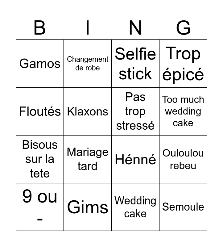 This bingo card has 16 words: Gims, Ouloulou rebeu, Selfie stick, Gamos, Bisous sur la tete, Changement de robe, Hénné, Wedding cake, Floutés, Klaxons, 9 ou -, Trop épicé, Mariage tard, Too much wedding cake, Pas trop stressé and Semoule.
