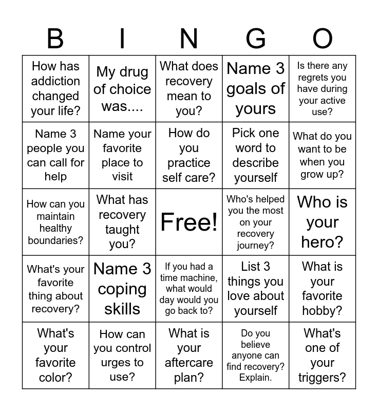 This bingo card has a free space and 24 words: Name 3 coping skills, How can you control urges to use?, How do you practice self care?, What's your favorite color?, Is there any regrets you have during your active use?, How has addiction changed your life?, Name 3 people you can call for help, My drug of choice was...., Who's helped you the most on your recovery journey?, If you had a time machine, what would day would you go back to?, Pick one word to describe yourself, How can you maintain healthy boundaries?, List 3 things you love about yourself, What is your favorite hobby?, Name your favorite place to visit, Do you believe anyone can find recovery? Explain., Who is your hero?, What does recovery mean to you?, What do you want to be when you grow up?, What has recovery taught you?, What's one of your triggers?, What's your favorite thing about recovery?, Name 3 goals of yours and What is your aftercare plan?.