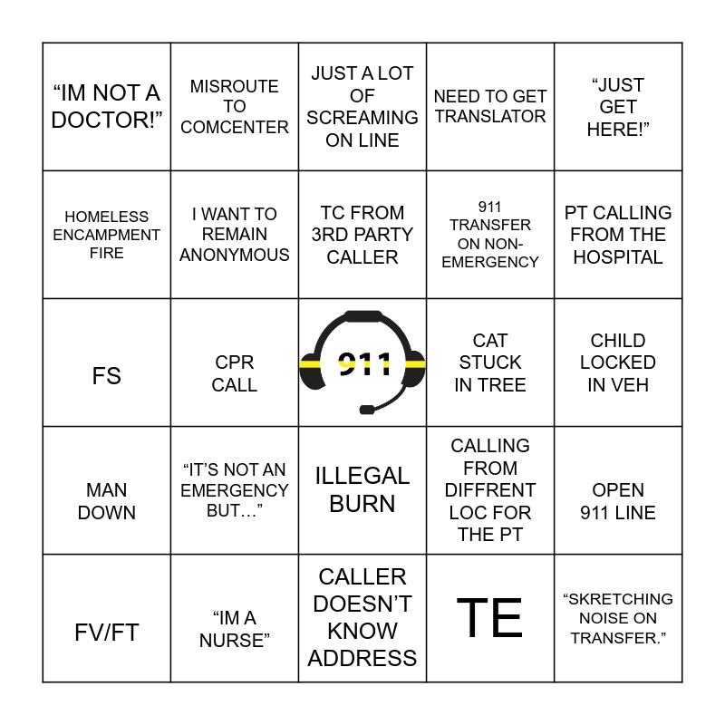 This bingo card has a free space and 24 words: “IT’S NOT AN EMERGENCY BUT…”, “IM A NURSE”, TC FROM 3RD PARTY CALLER, FV/FT, “JUST GET HERE!”, “IM NOT A DOCTOR!”, HOMELESS ENCAMPMENT FIRE, MISROUTE TO COMCENTER, CAT STUCK IN TREE, ILLEGAL BURN, 911 TRANSFER ON NON-EMERGENCY, FS, CALLING FROM DIFFRENT LOC FOR THE PT, OPEN 911 LINE, I WANT TO REMAIN ANONYMOUS, TE, CHILD LOCKED IN VEH, JUST A LOT OF SCREAMING ON LINE, PT CALLING FROM THE HOSPITAL, CPR CALL, “SKRETCHING NOISE ON TRANSFER.”, MAN DOWN, NEED TO GET TRANSLATOR and CALLER DOESN’T KNOW ADDRESS.