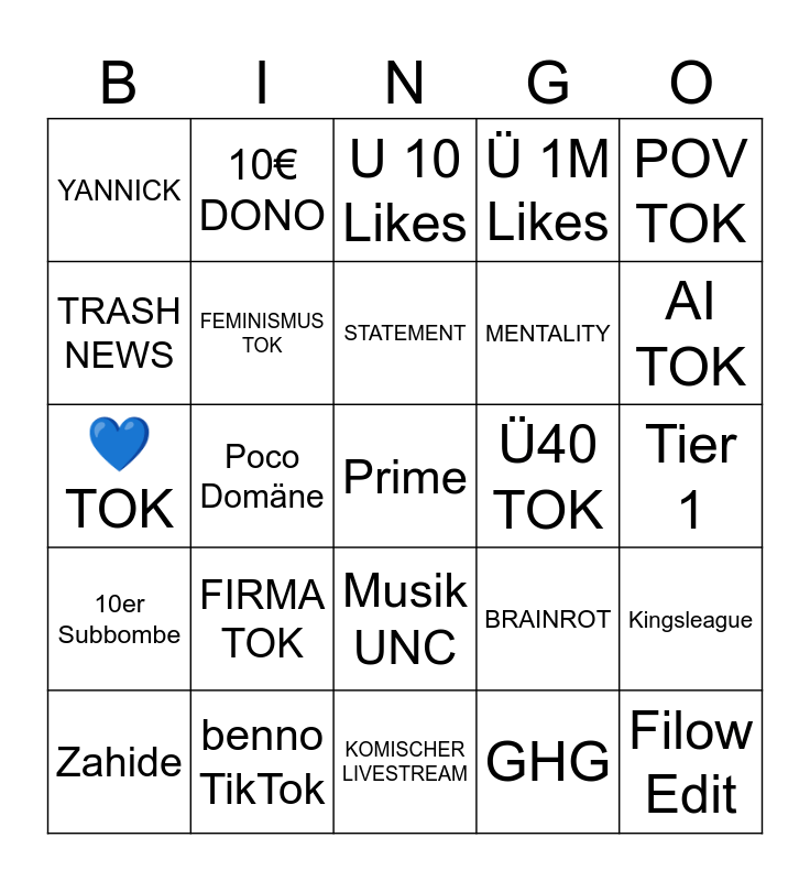 This bingo card has a free space and 24 words: FIRMA TOK, benno TikTok, STATEMENT, Zahide, POV TOK, YANNICK, TRASH NEWS, 10€ DONO, Ü40 TOK, Musik UNC, MENTALITY, 💙 TOK, BRAINROT, Kingsleague, FEMINISMUS TOK, GHG, Tier 1, U 10 Likes, AI TOK, Poco Domäne, Filow Edit, 10er Subbombe, Ü 1M Likes and KOMISCHER LIVESTREAM.