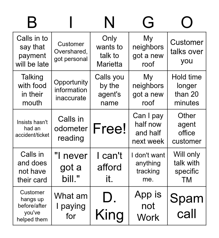 This bingo card has a free space and 34 words: ID Card Request, App is not Work, Why did my bill go up, Calls three times in a row without leaving VM, Calls in and does not have their card, Opportunity information inaccurate, Customer talks over you, Customer hangs up before/after you've helped them, Customer Overshared, got personal, IT escalates a ticket, Calls you by the agent's name, Only wants to talk to Marietta, Complains about rates but they went down, Hears smoke detector in the background, Can I pay half now and half next week, Hold time longer than 20 minutes, What am I paying for, Insists hasn't had an accident/ticket, "I never got a bill.", I don't want anything tracking me., I can't afford it., I have to ask my wife/spouse., Calls in to say that payment will be late, Other agent office customer, D. King, Spam call, My neighbors got a new roof, I can get this cheaper with _____., My neighbors got a new roof, Talking with food in their mouth, Claims call that resolves nothing, Calls in odometer reading, Will only talk with specific TM and Asks, "Can you make my price go down?".
