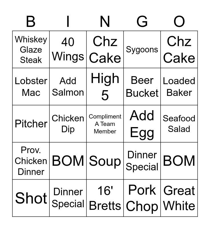 This bingo card has a free space and 24 words: BOM, Dinner Special, High 5, Shot, Chz Cake, Whiskey Glaze Steak, Lobster Mac, 40 Wings, Add Egg, Soup, Beer Bucket, Pitcher, Dinner Special, BOM, Add Salmon, Pork Chop, Seafood Salad, Chz Cake, Loaded Baker, Chicken Dip, Great White, Prov. Chicken Dinner, Sygoons and 16' Bretts.