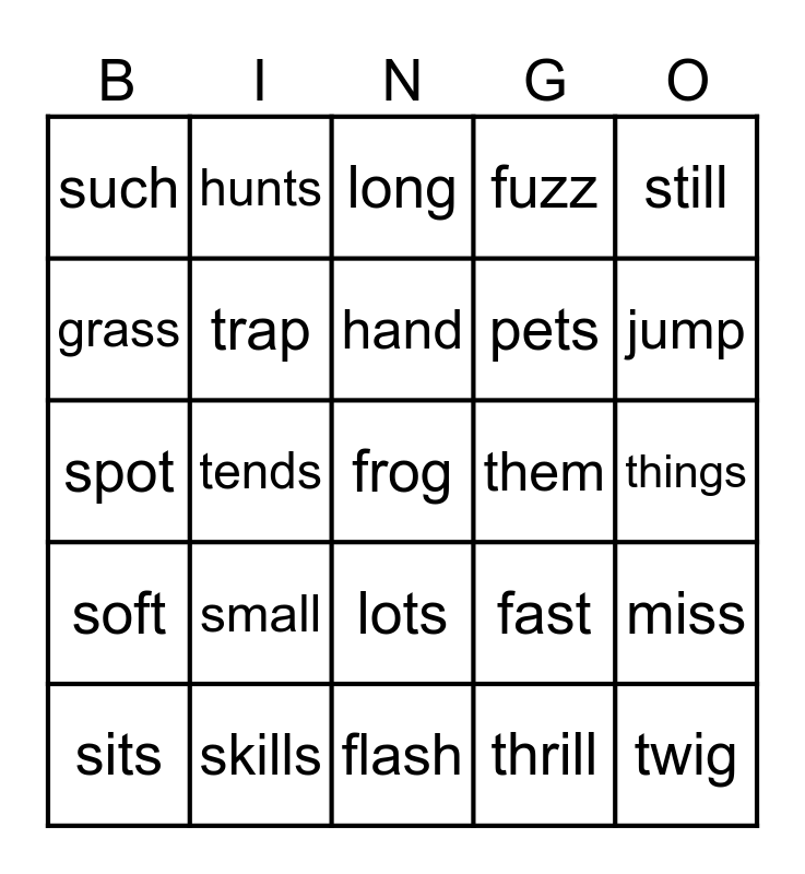 This bingo card has a free space and 24 words: small, skills, hand, sits, still, such, grass, hunts, them, lots, pets, spot, fast, miss, trap, thrill, things, long, jump, tends, twig, soft, fuzz and flash.
