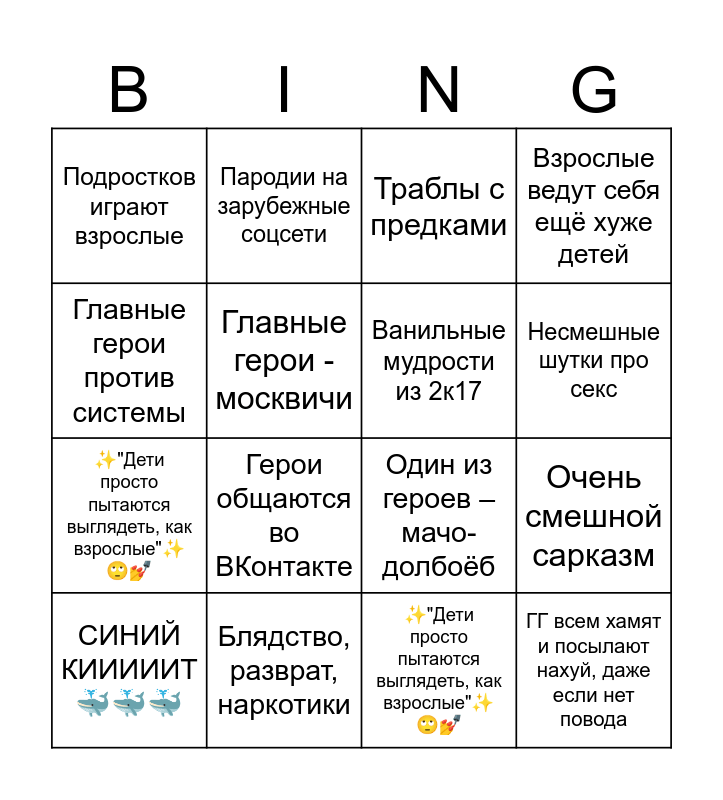 This bingo card has 20 words: Очень смешной сарказм, Одна из героинь – девчонка-бунтарка, Траблы с предками, ✨🤙Молодёжный сленг✨😜 (который придумал сценарист), СИНИЙ КИИИИИТ 🐳🐳🐳, Главные герои против системы, Блядство, разврат, наркотики, Подростков играют взрослые, ✨"Дети просто пытаются выглядеть, как взрослые"✨🙄💅, Пародии на зарубежные соцсети, Герои общаются во ВКонтакте, Один из героев – мачо-долбоёб, Главные герои - москвичи, ГГ всем хамят и посылают нахуй, даже если нет повода, Ванильные мудрости из 2к17, Шутки про мамку, Несмешные шутки про секс, Взрослые ведут себя ещё хуже детей, ✨"Дети просто пытаются выглядеть, как взрослые"✨🙄💅 and Один из героев – мачо-долбоеб.