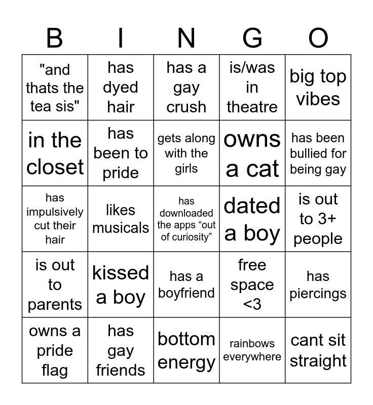 This bingo card has 25 words: kissed a boy, bottom energy, gets along with the girls, owns a pride flag, big top vibes, "and thats the tea sis", in the closet, has dyed hair, dated a boy, has a boyfriend, owns a cat, has impulsively cut their hair, free space <3, has piercings, has been to pride, cant sit straight, is out to 3+ people, has a gay crush, has been bullied for being gay, likes musicals, has downloaded the apps “out of curiosity”, has gay friends, is out to parents, is/was in theatre and rainbows everywhere.