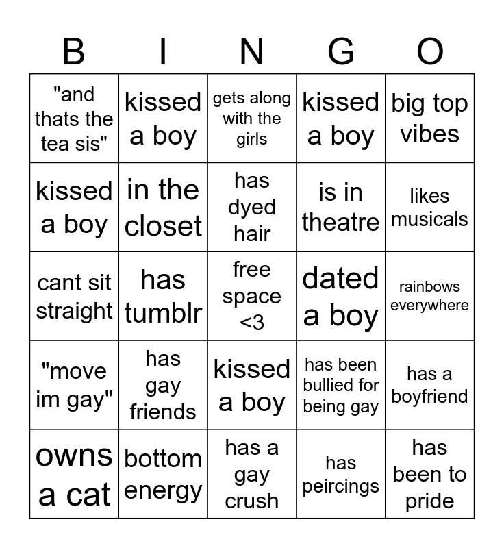This bingo card has a free space and 29 words: kissed a boy, bottom energy, gets along with the girls, owns a pride flag, big top vibes, "and thats the tea sis", in the closet, has dyed hair, dated a boy, has a boyfriend, owns a cat, has tumblr, has peircings, has been to pride, cant sit straight, is out to 3+ people, has a gay crush, has been bullied for being gay, likes musicals, "move im gay", has gay friends, is out to parents, is in theatre, rainbows everywhere, kissed a boy, kissed a boy, kissed a boy, kissed a boy and kissed a boy.
