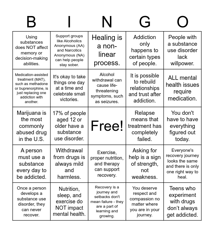 This bingo card has a free space and 24 words: Withdrawal from drugs is always mild and harmless., Nutrition, sleep, and exercise do NOT impact mental health., Alcohol withdrawal can cause life-threatening symptoms, such as seizures., Once a person develops a substance use disorder, they can never recover., People with a substance use disorder lack willpower., Using substances does NOT affect memory or decision-making abilities., Medication-assisted treatment (MAT), such as methadone or buprenorphine, is just replacing one addiction with another., Support groups like Alcoholics Anonymous (AA) and Narcotics Anonymous (NA) can help people stay sober., Relapse means that treatment has completely failed., Exercise, proper nutrition, and therapy can support recovery., It is possible to rebuild relationships and trust after addiction., Marijuana is the most commonly abused drug in the U.S., Asking for help is a sign of strength, not weakness., Everyone's recovery journey looks the same and there is only one right way to heal., It's okay to take things one day at a time and celebrate small victories., You deserve respect and compassion no matter where you are in your journey., You don't have to have everything figured out today., Healing is a non-linear process., ALL mental health issues require medication., 17% of people aged 12 or older have a substance use disorder., Teens who experiment with drugs don’t always get addicted., A person must use a substance every day to be addicted., Addiction only happens to certain types of people. and Recovery is a journey and setbacks don't mean failure - they are a part of learning and growing..