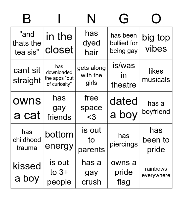 This bingo card has a free space and 24 words: kissed a boy, bottom energy, gets along with the girls, owns a pride flag, big top vibes, "and thats the tea sis", in the closet, has dyed hair, dated a boy, has a boyfriend, owns a cat, has downloaded the apps “out of curiosity”, has piercings, has been to pride, cant sit straight, is out to 3+ people, has a gay crush, has been bullied for being gay, likes musicals, has childhood trauma, has gay friends, is out to parents, is/was in theatre and rainbows everywhere.