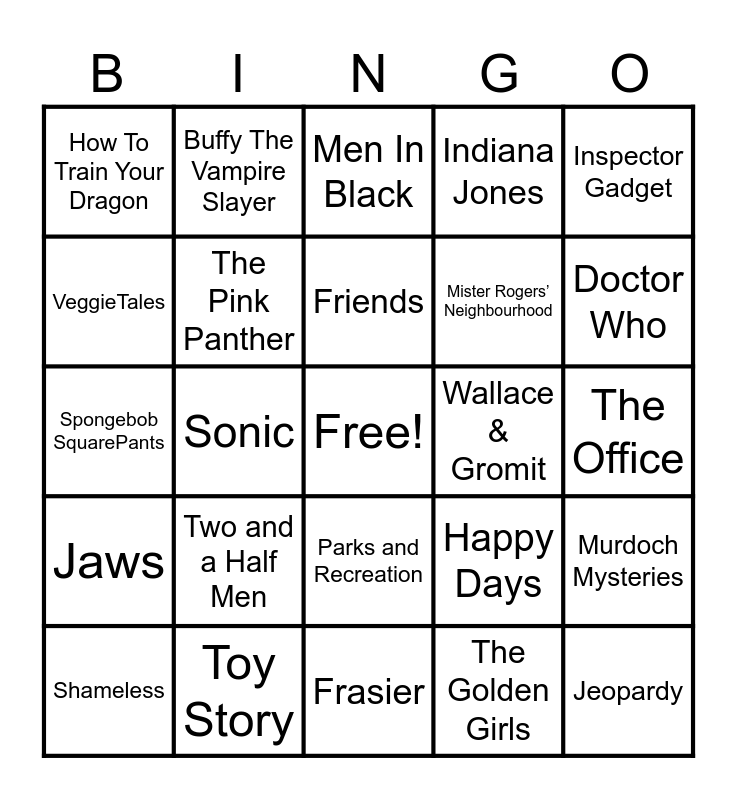 This bingo card has a free space and 39 words: Law & Order, The Twilight Zone, Mission Impossible, The Pink Panther, Shameless, Parks and Recreation, Friends, Jurassic Park, Inspector Gadget, Jaws, Sonic, Indiana Jones, Jeopardy, The Office, Wallace & Gromit, Two and a Half Men, Family Guy, How To Train Your Dragon, Star Trek, Happy Days, VeggieTales, Frasier, Mister Rogers’ Neighbourhood, Doctor Who, The Walking Dead, Dora The Explorer, Schitt’s Creek, Game of Thrones, The Jetsons, Buffy The Vampire Slayer, Bob’s Burgers, Fraggle Rock, Men In Black, Toy Story, The Golden Girls, M.A.S.H, Murdoch Mysteries, Spongebob SquarePants and Super Mario.